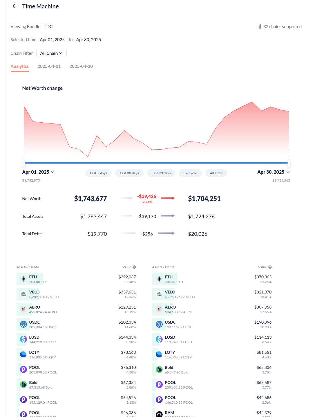The face value of assets controlled by the Collective (excluding grants) decreased by 2.26% in February, falling from $1,743,677 on April 1 to $1,704,251 by April 30. This total comprises 42% in locked assets, 11% in L2 liquid positions, and 32% in liquid positions on mainnet. The Collective’s Perma-LP wallet holds the remaining 15% in assets. The slight decrease in treasury value was primarily driven by the ongoing decline in the Collective’s liquidity-driving positions, further compounded by broader market downturns affecting liquid asset valuations. However, the treasury has remained relatively resilient compared to the overall market, largely thanks to its substantial stablecoin holdings.