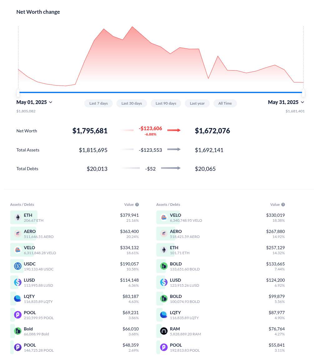 Mainnet operations remained active throughout May, beginning with the rebalancing of auto-compounding positions early in the month, followed by BOLD-related activities toward the end. The ants engaged with Liquity v2, staking our LQTY position and voting in the Collective’s PIL gauge. BOLD rewards from this initiative were used to strengthen the Collective’s Velodrome BOLD/LUSD Perma-LP and to fund bribes on Aerodrome BOLD pools. Additional operations included minting BOLD and depositing it into the ETH stability pool.